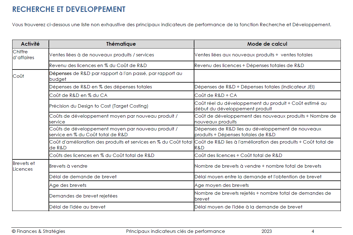 Cet outil (format pdf) recence près de 700 KPI (indicateurs clés de performance avec leurs modalités de calcul) à intégrer dans vos tableaux de bord autour des thématiques suivantes : R&D, achats - approvisionnements, fournisseurs, production, maintenance, gestion de la supply chain, gestion des stocks et entreposage, transport, informatique, service client, marketing, commercial, prévisions de vente, gestion des ressources humaines, finances, comptabilité